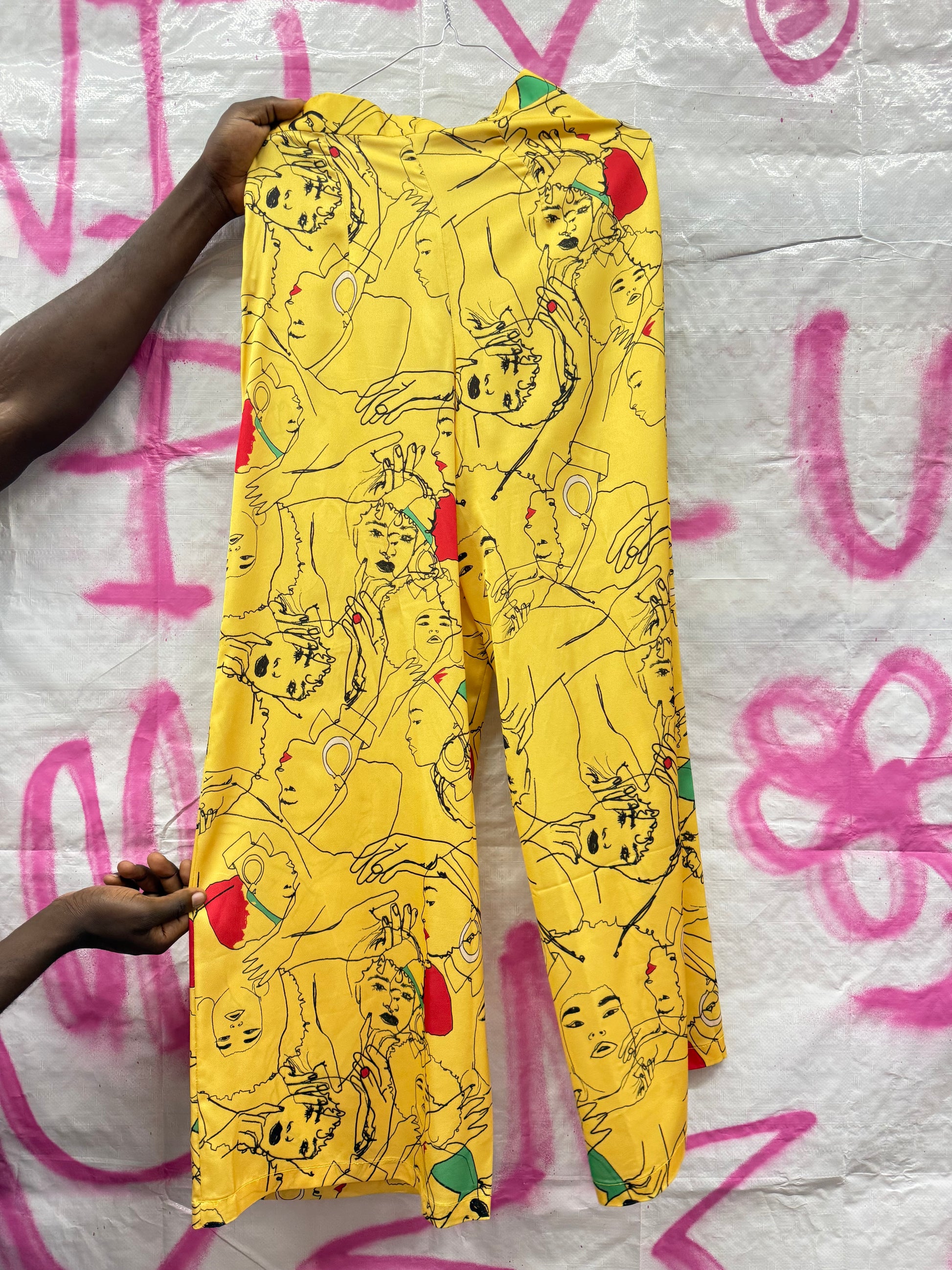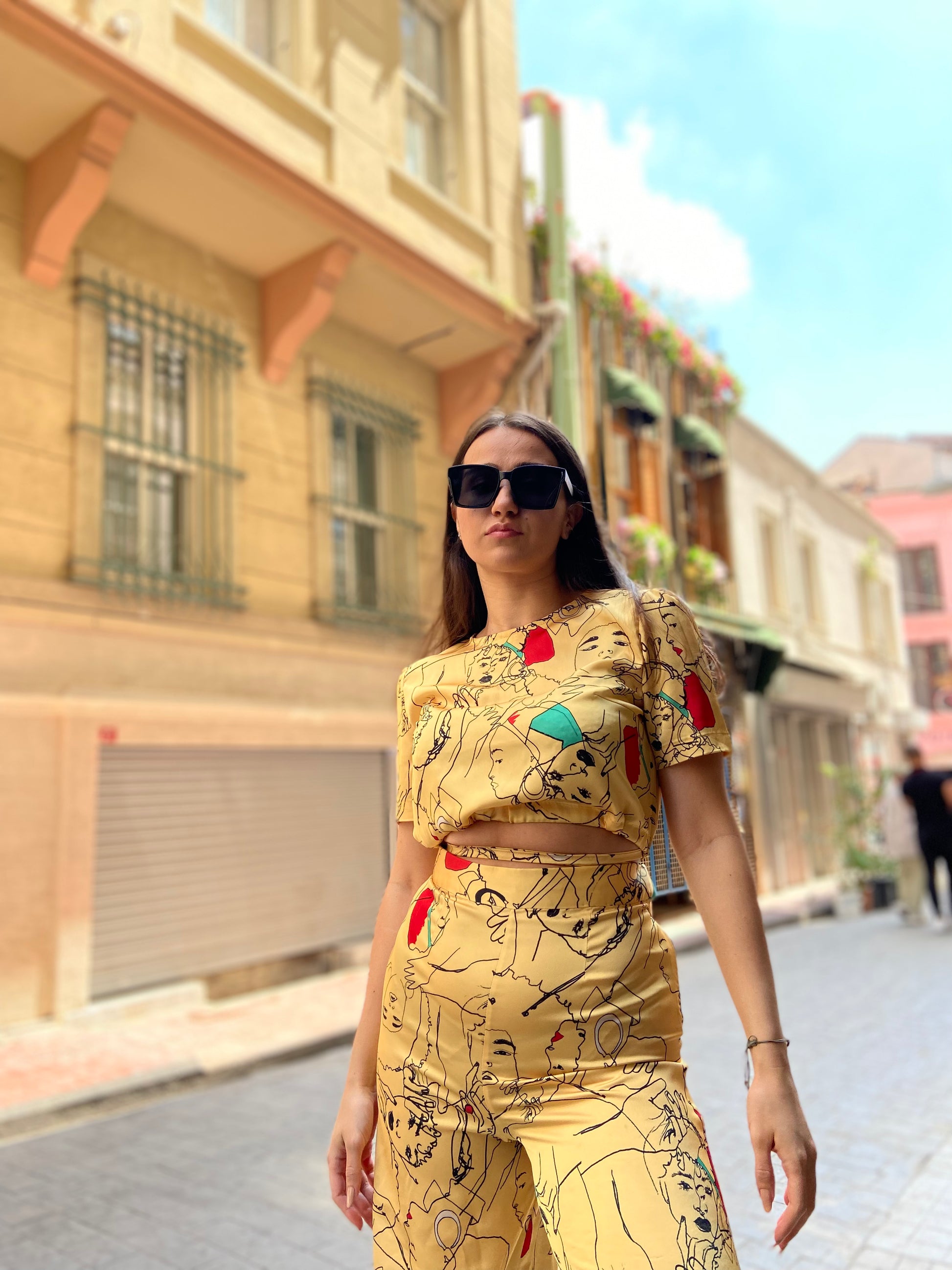 Bazı pantolonlar var ki sessiz kalamaz. Bu saten pantolon, el çizimi kadın silüetleriyle dolu deseniyle dikkatleri senin üzerinde toplar. Sarının en cesur tonu, özgüvenini parlatırken rahat kalıbı gün boyu sana eşlik eder.