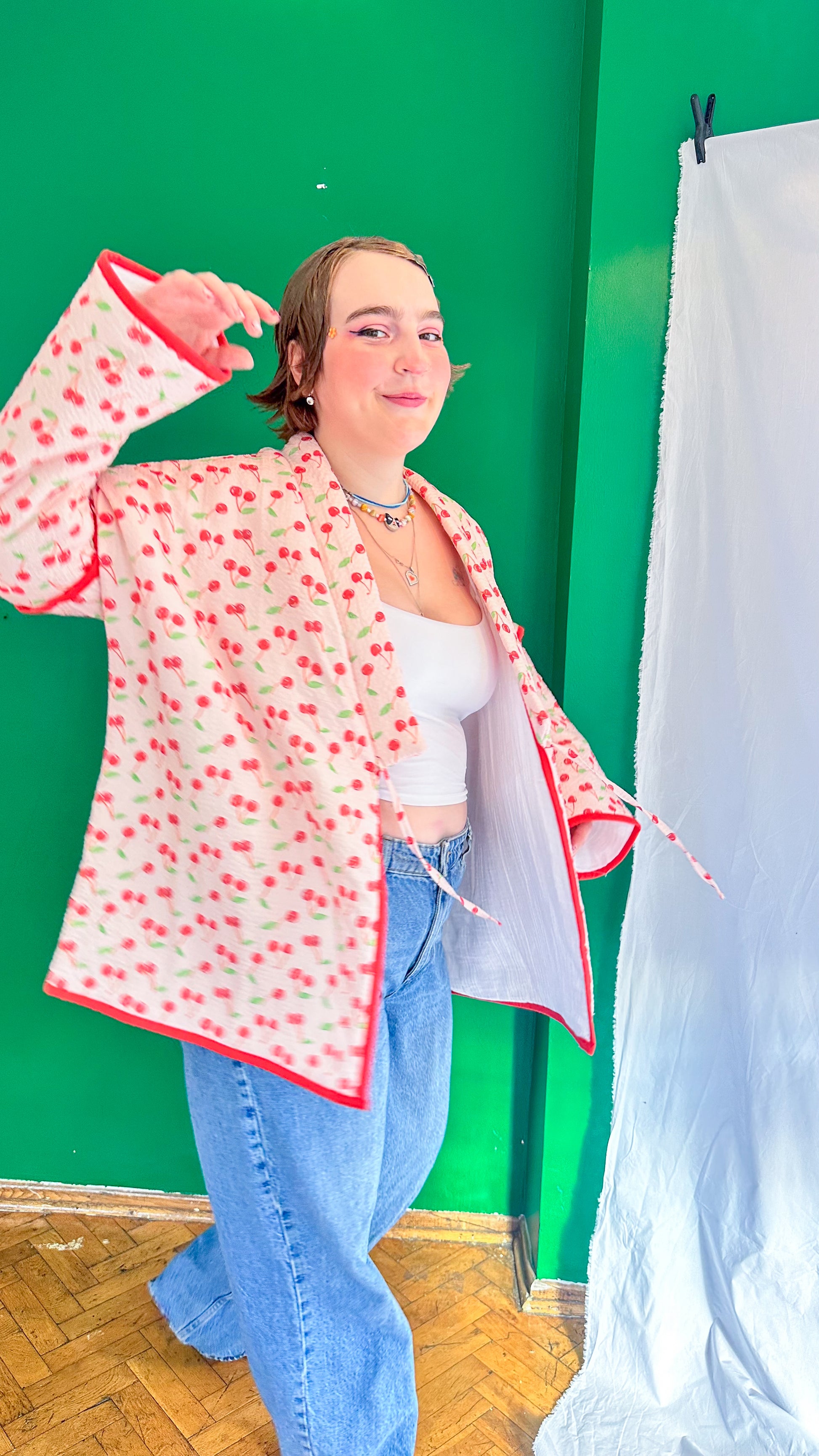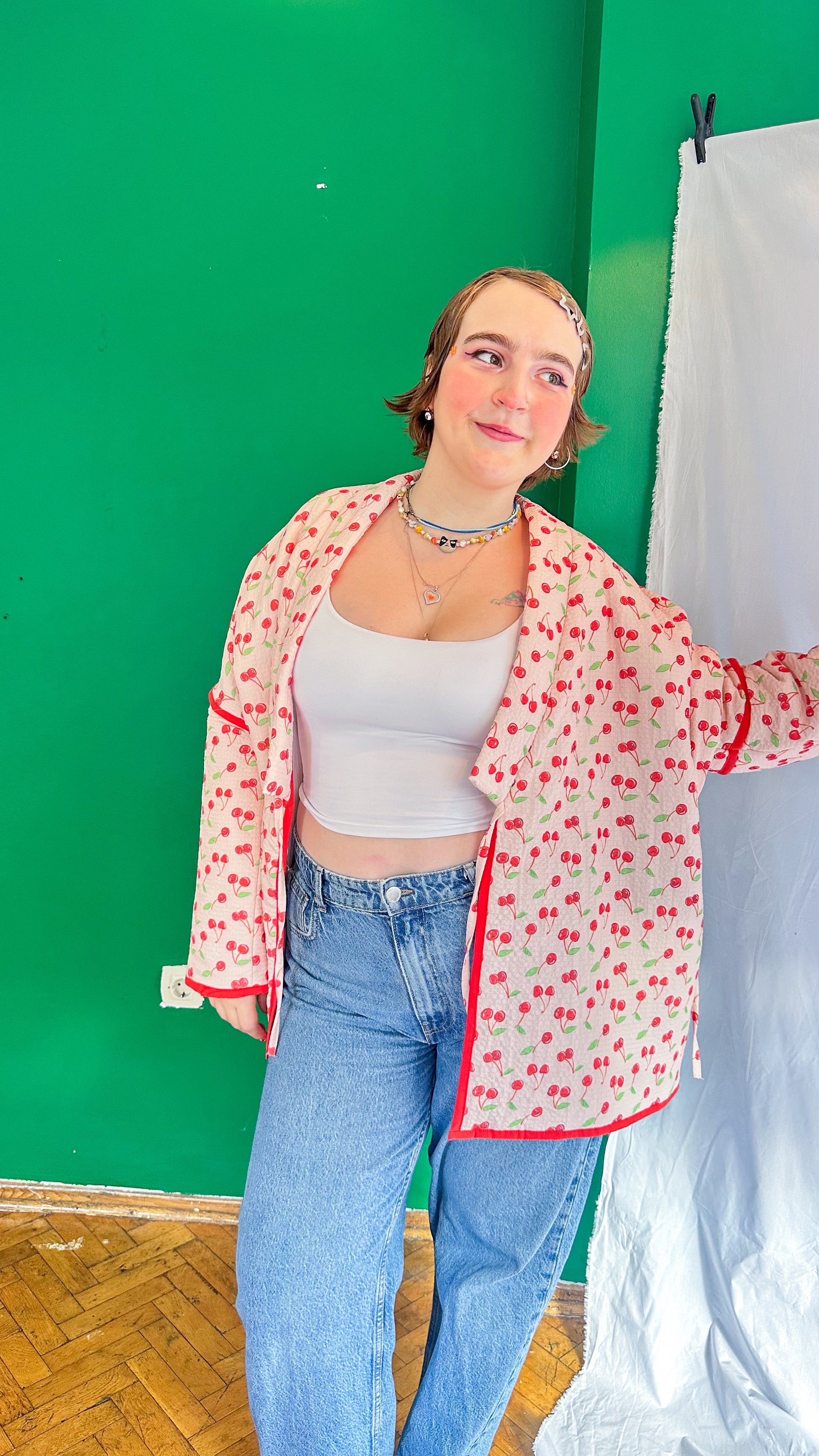 Luna, üzerindeki mini kirazlarla sizi ilk bakışta gülümseten, hem içi hem dışı tamamen %100 müslin kumaştan üretilmiş ultra rahat bir kimono ceket.