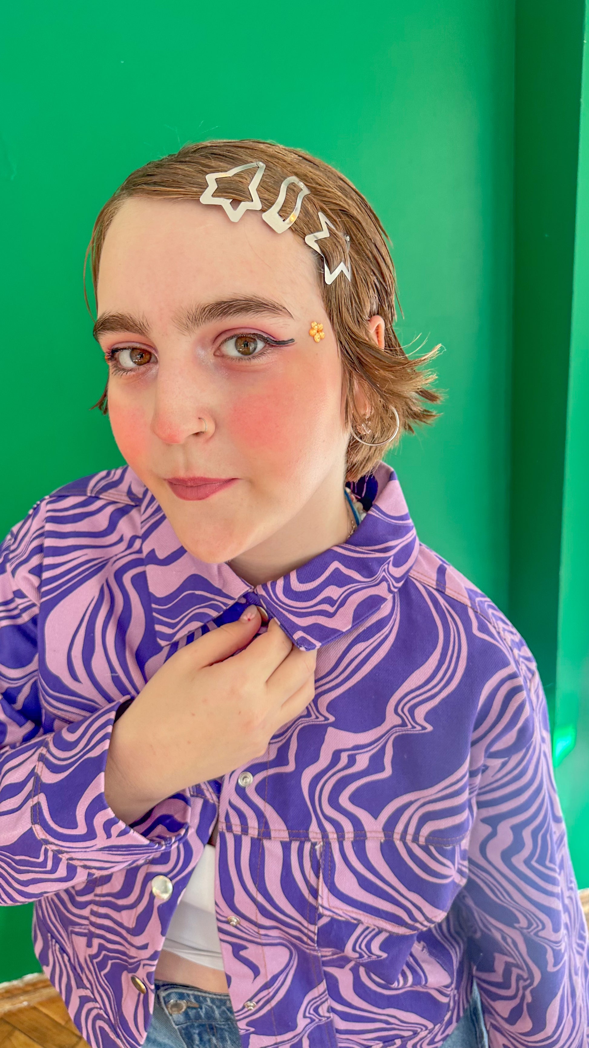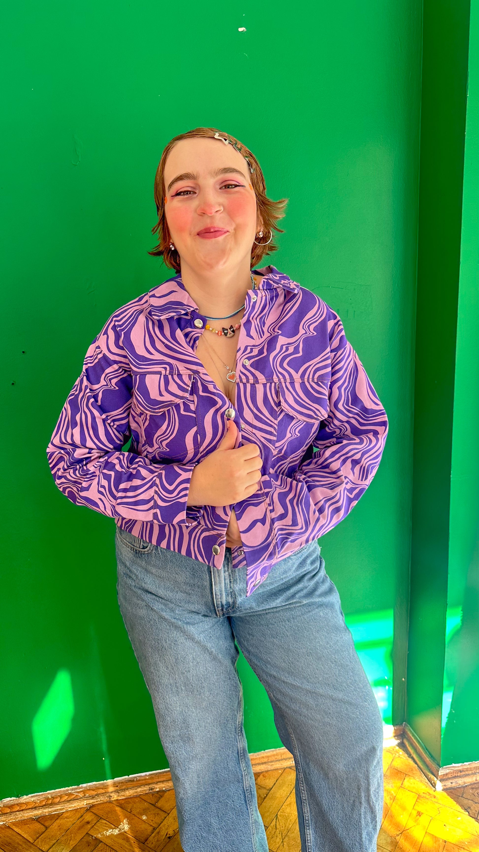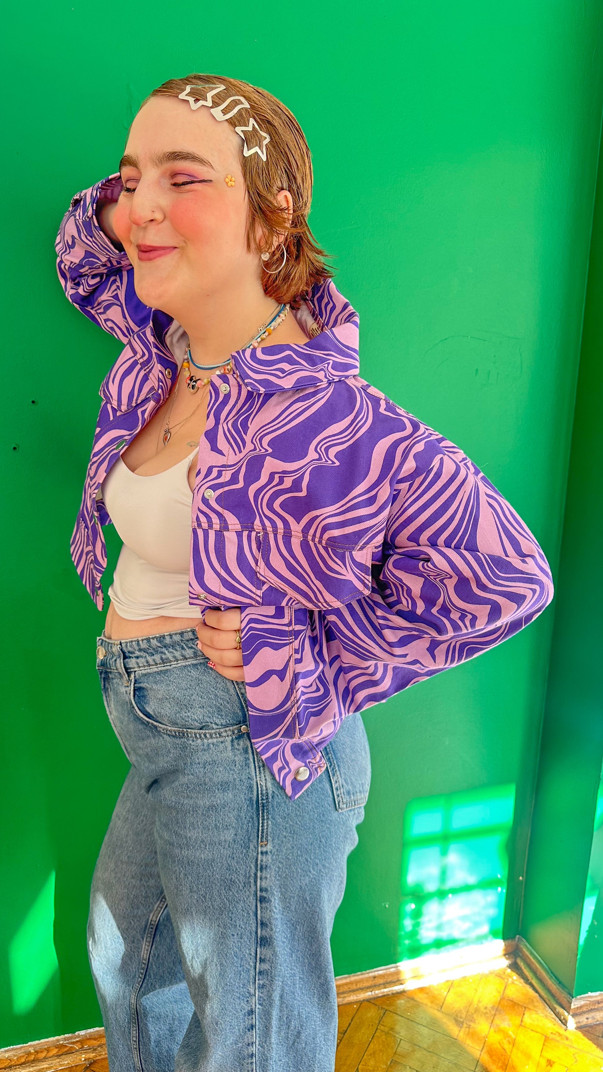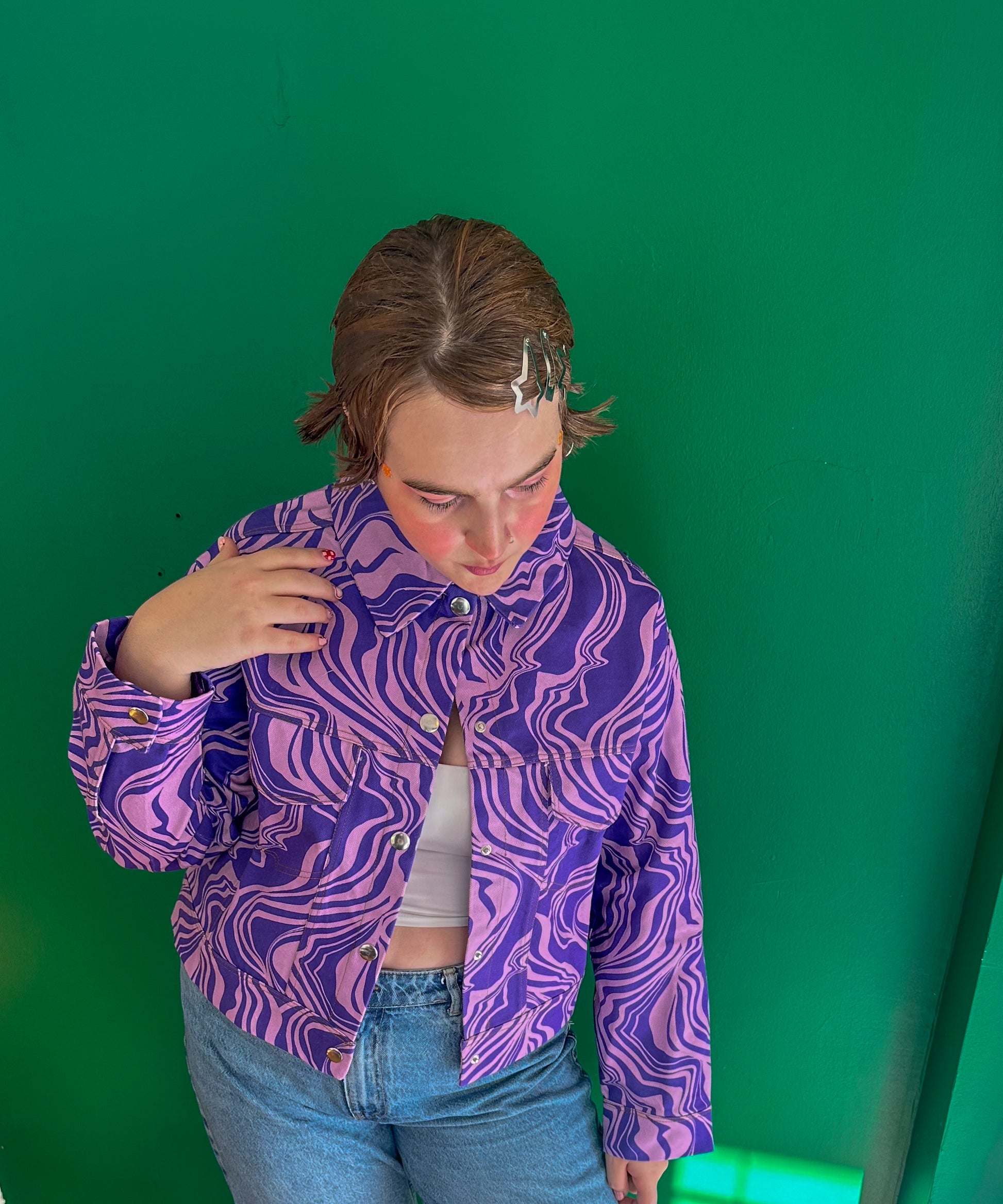 Mor ve lila dalga deseninin sanatsal akışı, tok canvas kumaşın duruşuyla birleşiyor ve ortaya hem cool hem de “beni gördüğünde aklın kalacak” bir ceket çıkıyor.