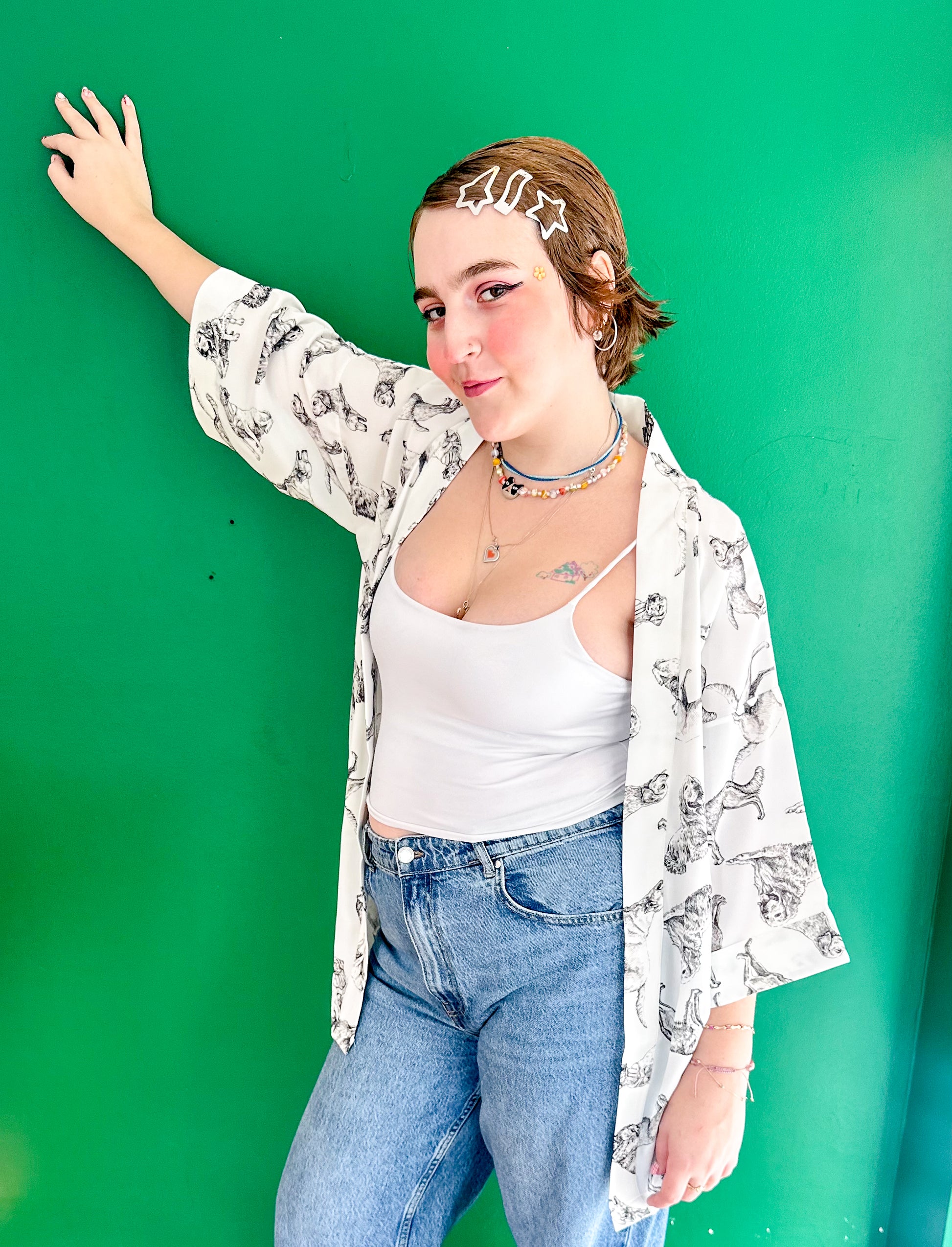 “Who Let The Dogs Off?” desenli kimono ceket, sanat galerisinden fırlamış gibi duran köpek illüstrasyonlarıyla stiline eğlenceli ama şık bir dokunuş katıyor.